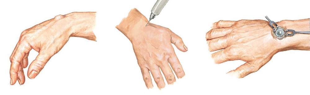 Surgical removal remains the "gold standard" — it is considered the most effective method for treating ganglion cysts. During the operation the surgeon excises the entire ganglion complex, including the cyst, its stalk, and a portion of the adjacent joint capsule.