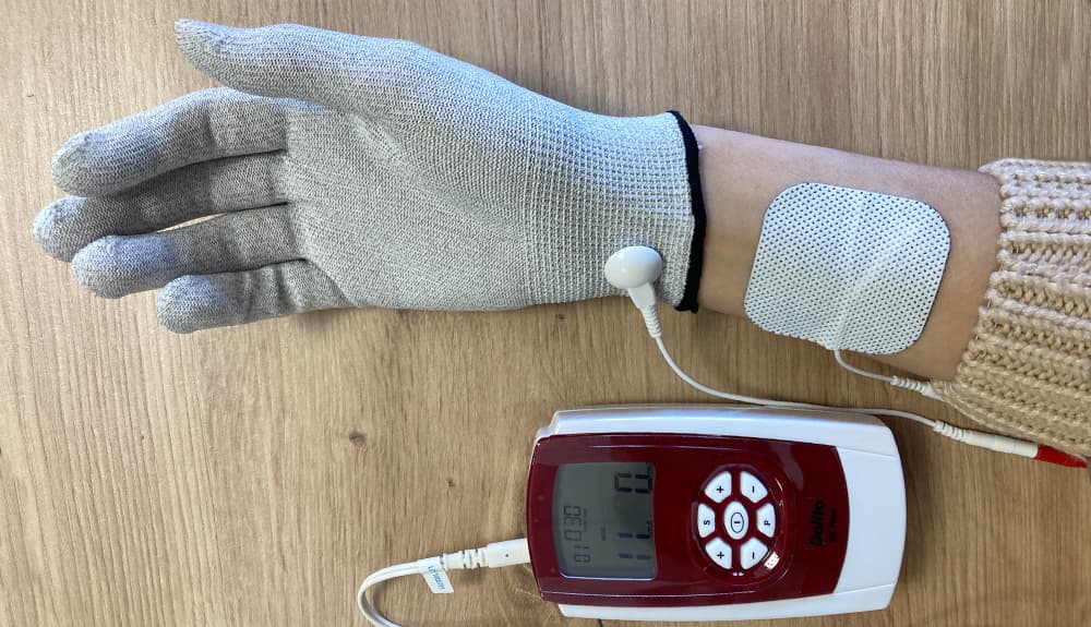 Connect the cable to the device. Attach the positive (red) cable end to the glove and the negative (black) end to the self-adhesive electrode.