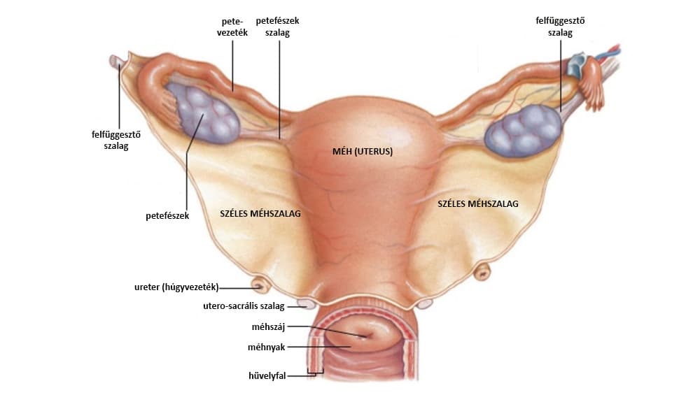 The bladder and the uterus are covered from above by the peritoneum, which also helps anchor them into the pelvis. In addition, the uterus is fixed by ligaments to the pelvic structures and the sacrum. Think of it like a chandelier hung from the ceiling by wires or straps.
